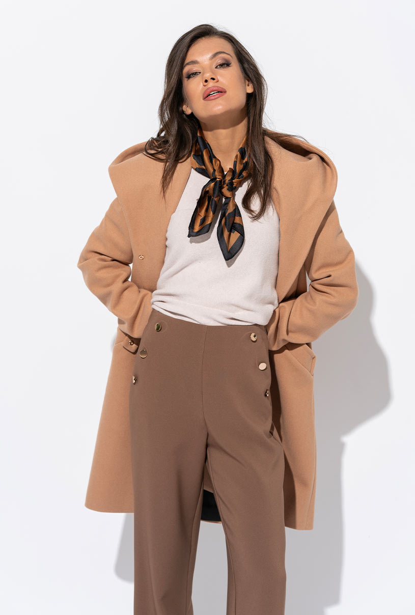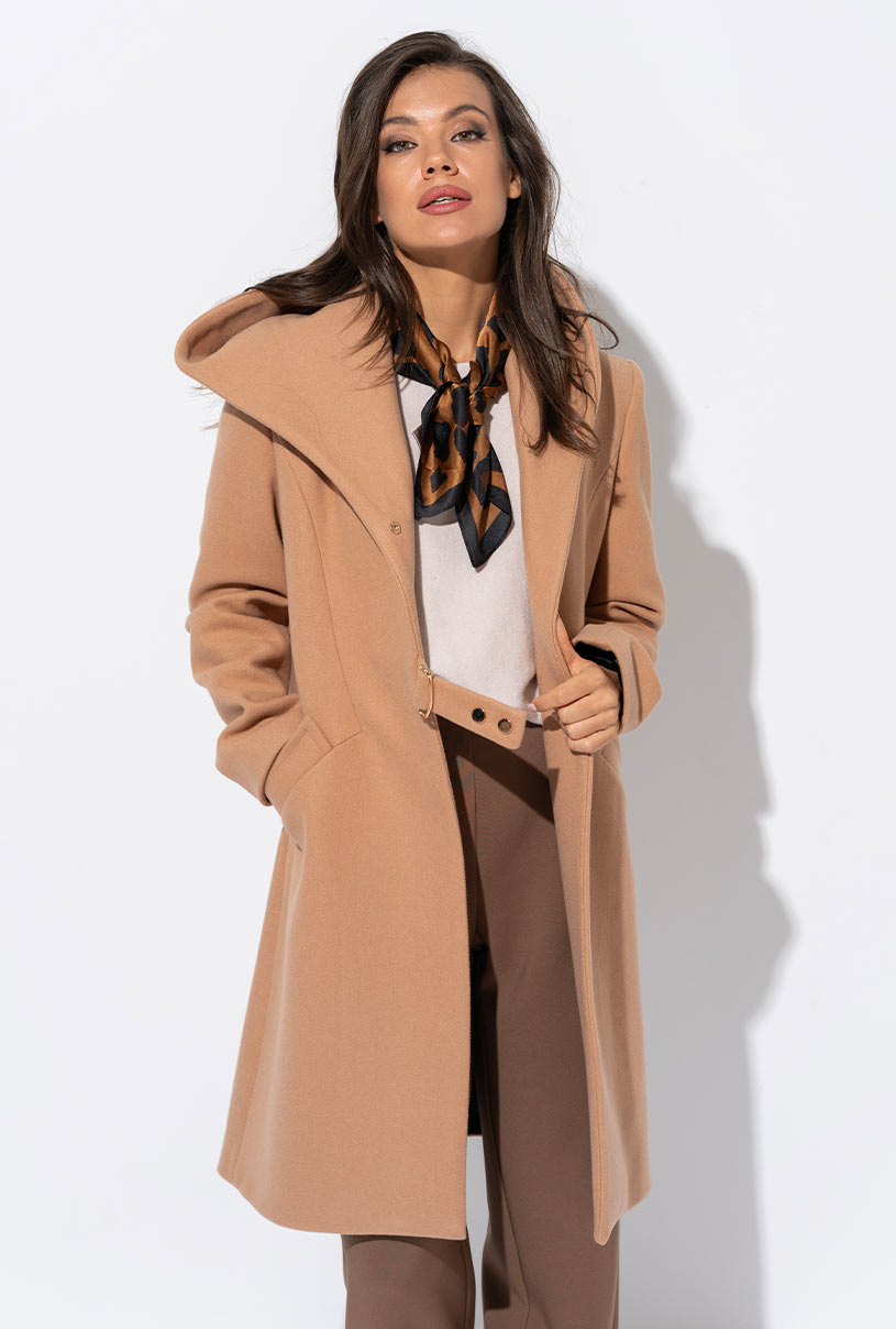 Palton dama camel Rosana cu gluga si catarama decorativa