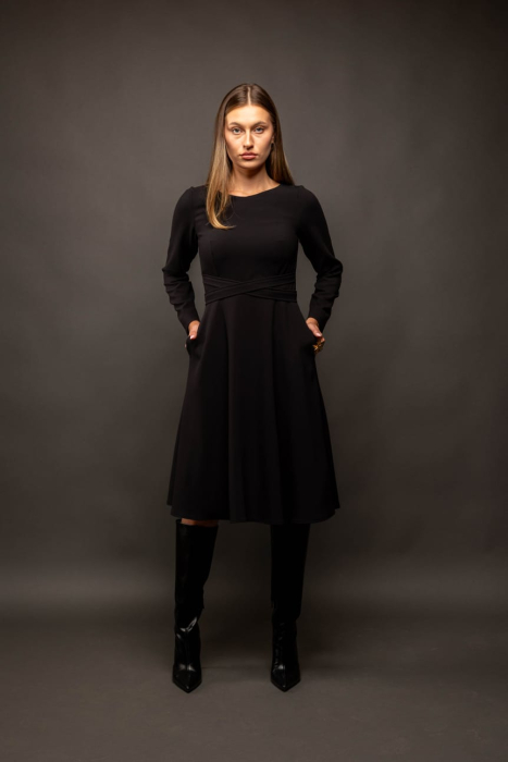 Rochie neagra cu design elegant si feminin, potrivita pentru tinute rafinate de zi sau seara. Croiala in clos avantajeaza silueta, iar talia este evidentiata printr-un detaliu incrucisat care ofera un plus de stil si echilibru vizual. Materialul are o cadere fluida, fiind confortabil si placut la purtare. Este o piesa versatila, usor de accesorizat, ideala pentru evenimente, birou sau iesiri elegante.
